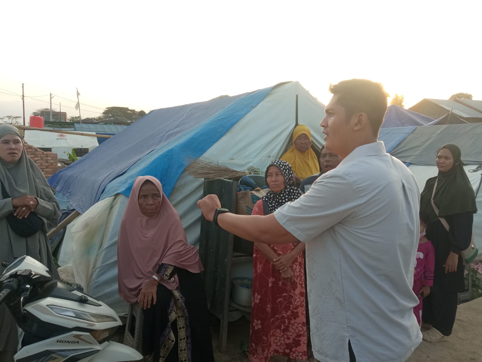 M. Yusuf berdiri di depan tendanya. Ia menarik tali terpal yang mulai kendur, menahan bocor yang tak pernah benar-benar berhenti. Di dalam, lantai masih lembap. Bau tanah basah belum hilang. Listrik belum masuk.