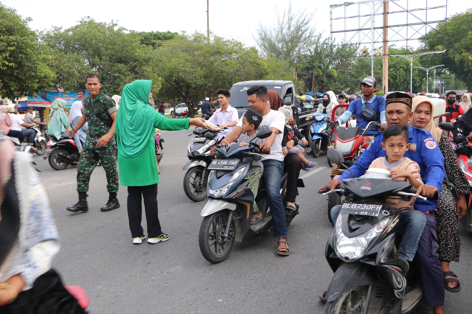 FOTO UTAMA: Ketua Persit Kartika Chandra Kirana Cabang XXI Dim 0104 Koorcab Rem 011 PD Iskandar Muda, Ny. Nita Agus Al Fauzi saat membagikan takjil berbuka puasa kepada para pengguna jalan yang melintas di depan Makodim setempat, Jumat (31/3). Waspada/dede