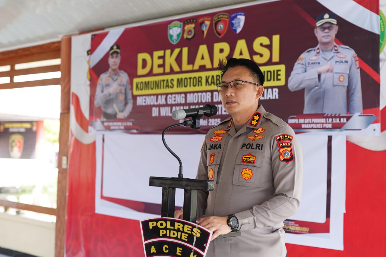 Kapolres Pidie AKP Jaka Mulyana menyampaikan deklarasi ini dilaksanakan dalam upaya membentuk komitmen, pernyataan sikap seluruh komunitas motor menolak keberadaan geng motor dan balapan liar di Kabupaten Pidie.
