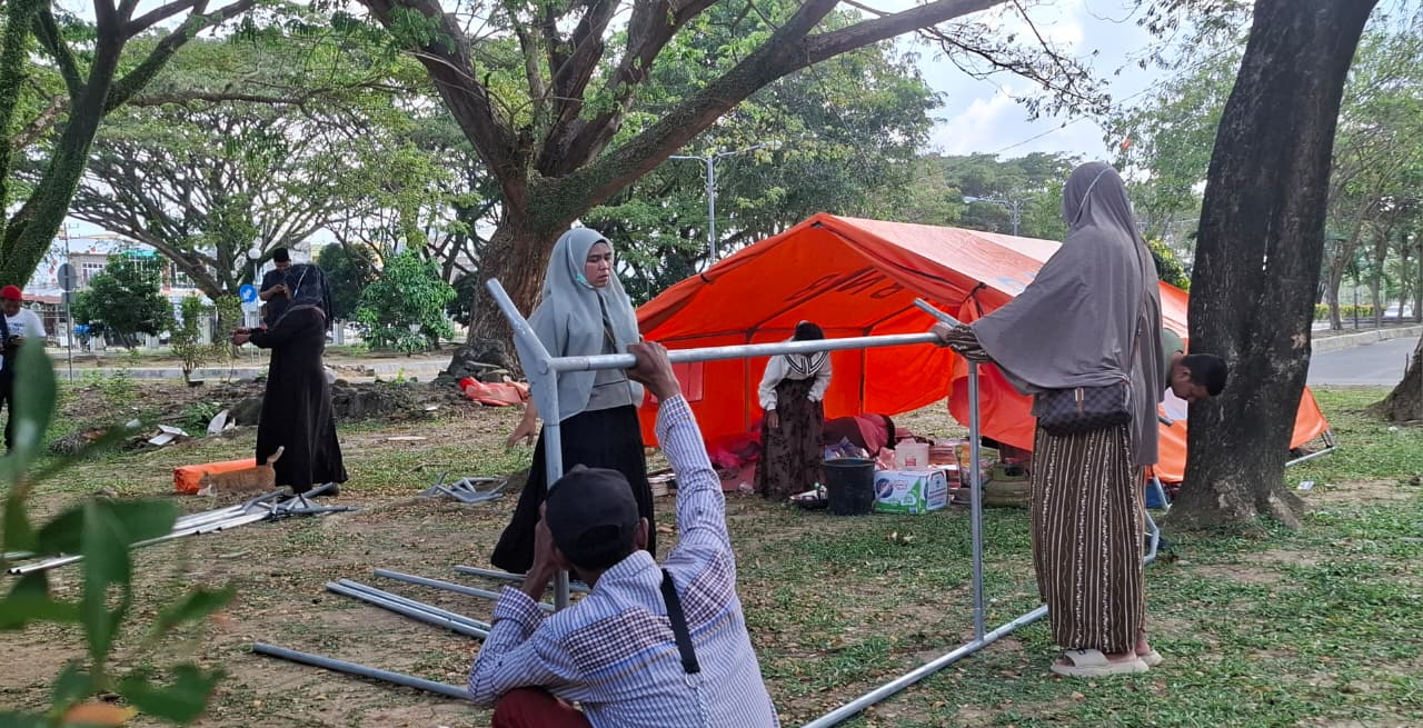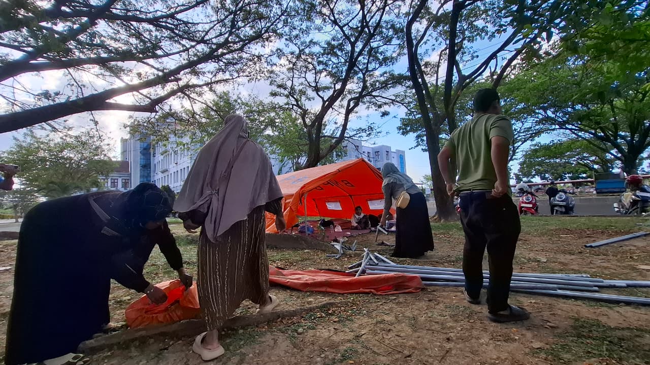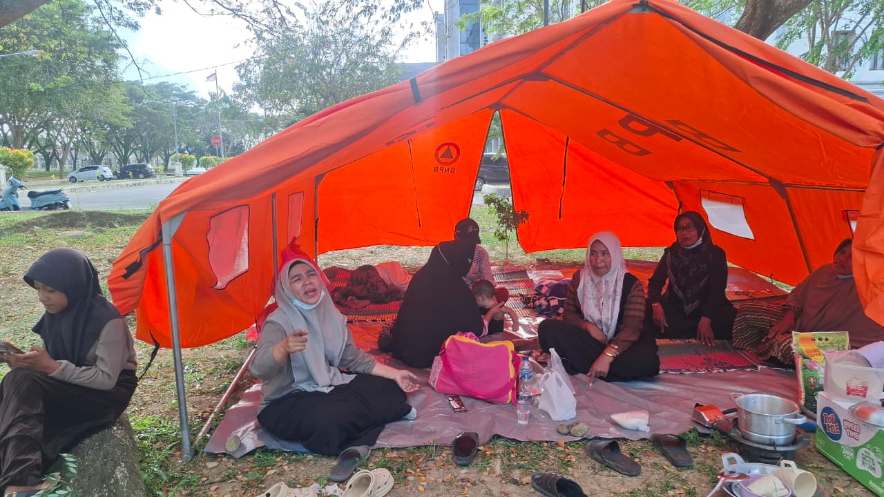 BIREUEN (Waspada.id): Lima Kepala Keluarga (KK), Korban banjir bandang dan longsor warga Gampong Kapa, Kecamatan Peusangan, Kabupaten Bireuen, mendirikan tenda di halaman samping kantor Bupati Bireuen, Kamis (12/3).