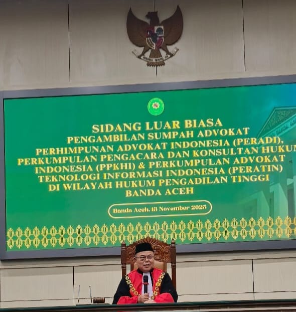 Pengambilan sumpah terhadap 71 Advokat baru di Aceh, itu dilakukan dalam agenda sidang luar biasa yang dipimpin oleh Ketua Pengadilan Tinggi yang dihadiri oleh Hakim Tinggi Kamaluddin, Hakim Ad Hoc Taqwaddin, dan Panitera Muda Hukum. Turut hadir juga Ketua Peradi, Ketua PPKHI, dan Ketua Peratin.