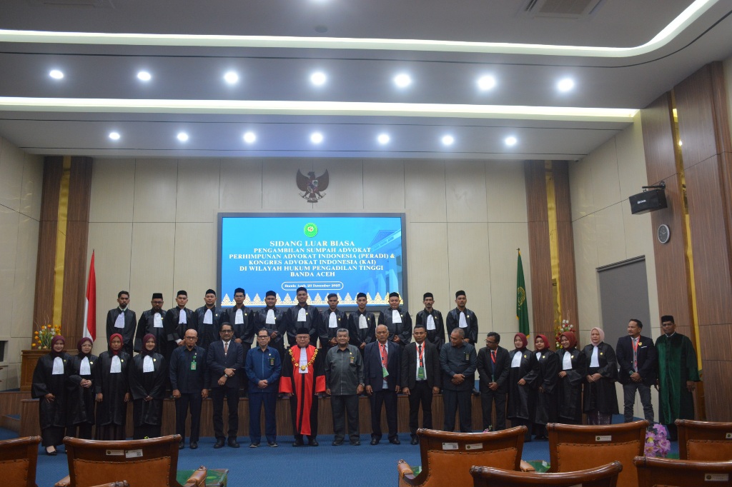 BANDA ACEH (Waspada.id): Ketua Pengadilan Tinggi (KPT) Banda Aceh, Nursyam, SH, MHum, bertempat di Ruang Sidang Utama Pengadilan Tinggi, pada Selasa 23 Desember 2025 melantik dan mangambil sumpah 20 orang Advokat yang berasal dari Perhimpunan Advokat Indonesia (Peradi) dan Kongres Advokat Indonesia (KAI).