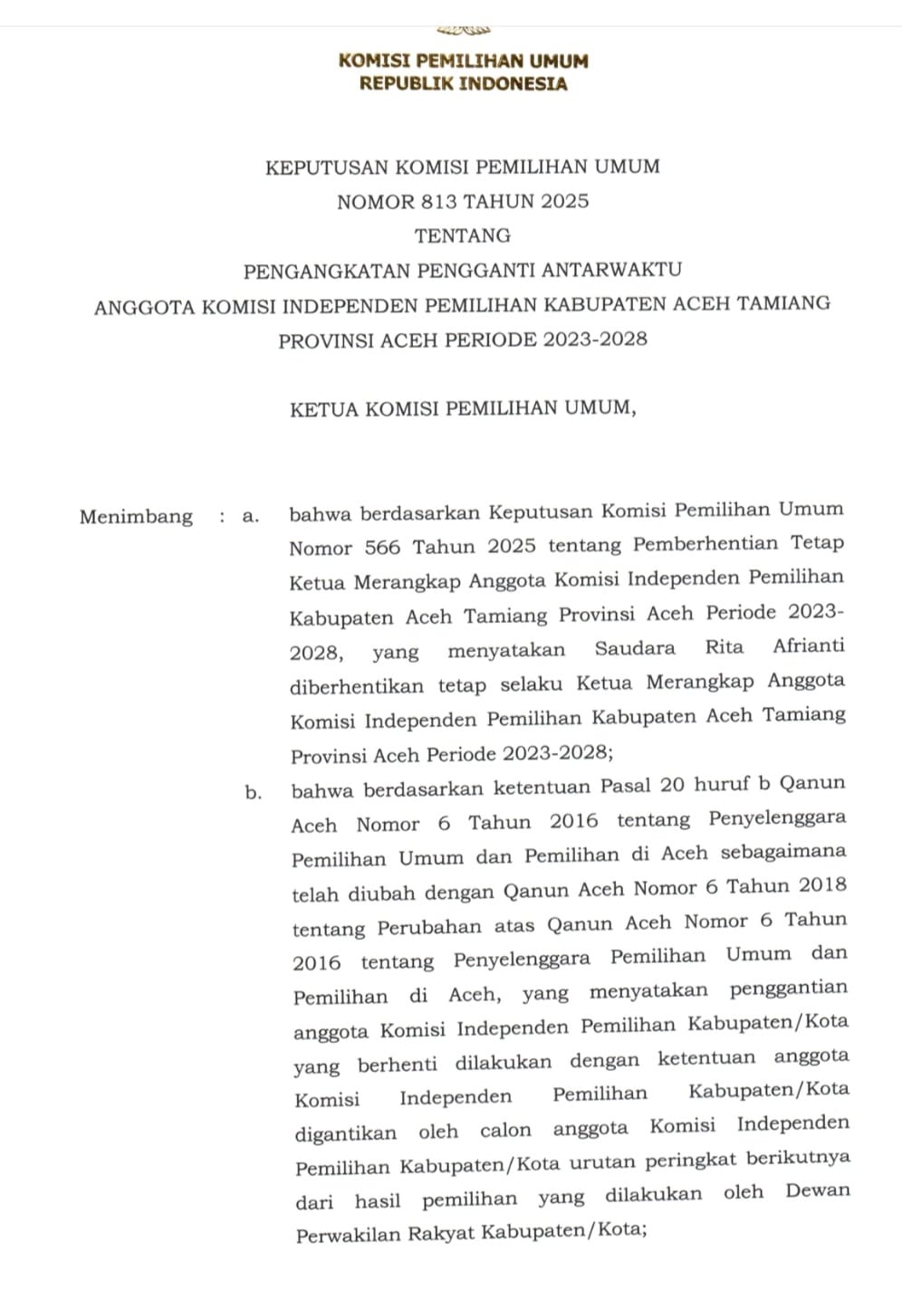 Berdasarkan dokumen hasil penelusuran Waspada.id, Kamis (13/11), terkesan ada dugaan KPU RI mengabaikan kedua surat yang diterbitkan oleh DPRK Aceh Tamiang, pasalnya, KPU RI pada tanggal 18 September 2025 menerbitkan Surat Keputusan Nomor 813 Tahun 2025 tentang Pengangkatan Pengganti Antar Waktu Anggota KIP Kabupaten Aceh Tamiang Provinsi Aceh Periode 2023-2028, tetapi surat keputusan KPU tidak mencantumkan kedua surat usulan dari DPRK Aceh Tamiang sebagai dasar konsideran pengambilan keputusan oleh KPU dalam menerbitkan SK Nomor 813 tahun 2025 tersebut.