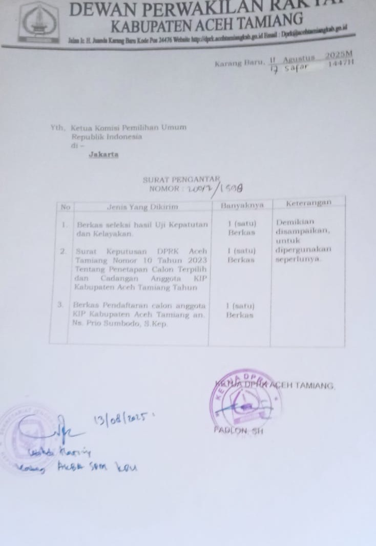 Selain itu, masih menurut penelusuran Waspada.id, DPRK Aceh Tamiang pada tanggal 11 Agustus 2025 menerbitkan surat pengantar Nomor: 200/2/1598 yang berisi usulan PAW Anggota KIP Kabupaten Aceh Tamiang periode 2023-2028.