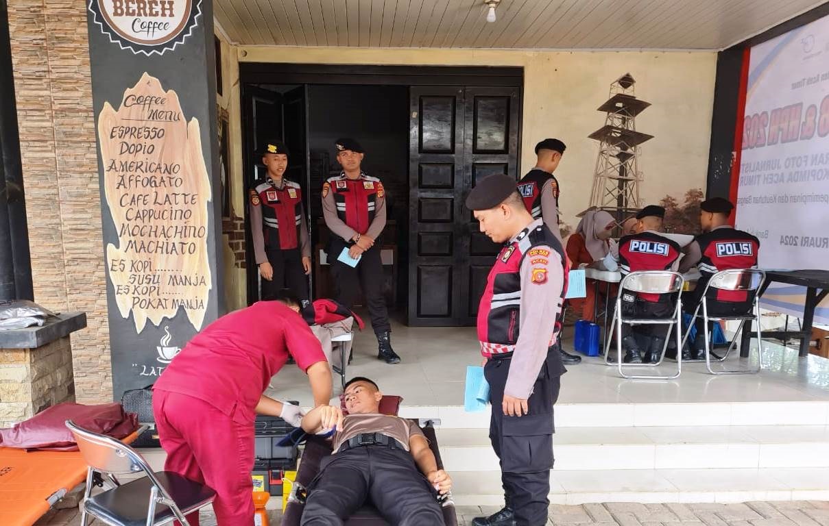IDI (Waspada): Bertepatan dengan Hari Pers Nasional (HPN) dan HUT Persatuan Wartawan Indonesia (PWI) Aceh Timur Tahun 2024, personel Polres Aceh Timur ‘menyerbu’ lokasi HPN untuk melakukan aksi donor darah di Komplek Idi Sport Center (ISC) Aceh Timur di Idi.