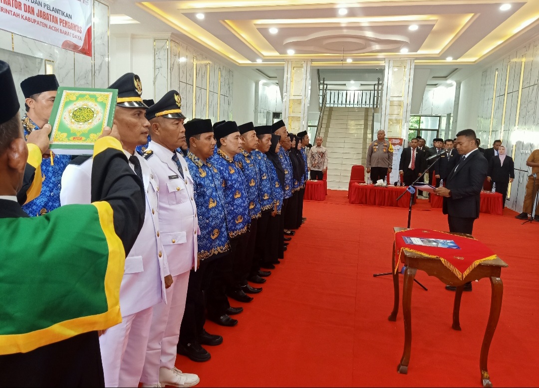 BLANGPIDIE (Waspada.id): Bupati Aceh Barat Daya (Abdya), Dr Safaruddin, SSos, MSP, kembali melantik pejabat di lingkungan Pemerintah Kabupaten (Pemkab) Abdya, di Lobi Kantor Bupati Abdya, Senin (22/12), dengan jumlah sebanyak 58 pejabat eselon III dan IV dalam jabatan Administrator dan Pengawas.