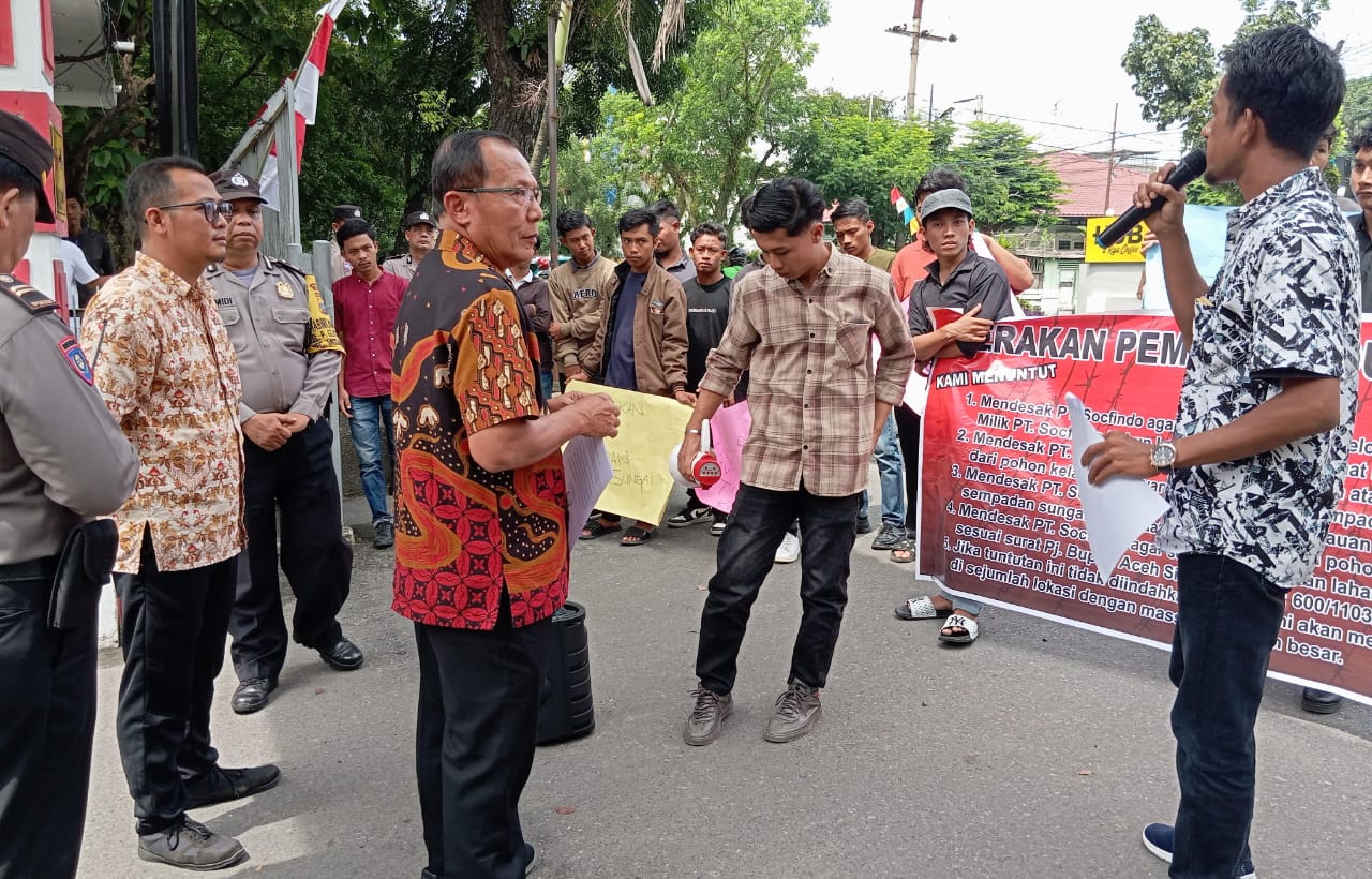 SINGKIL (Waspada): Puluhan massa gabungan mahasiswa dan pemuda dari Kabupaten Aceh Singkil menggelar aksi unjuk rasa di Kantor PT Socfindo Indonesia, di Medan Sumatera Utara.