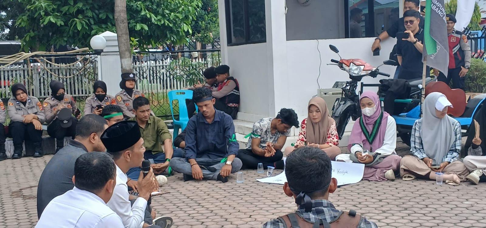 BIREUEN (Waspada): Puluhan mahasiswa yang tergabung dalam Himpunan Mahasiswa Islam Majelis Penyelamatan Organisasi (HMI-MPO) Bireuen, unjuk rasa Refleksi 19 tahun MoU Helsinki di depan Kantor Dewan Perwakilan Rakyat Kabupaten (DPRK), Bireuen, Rabu, (14/8).