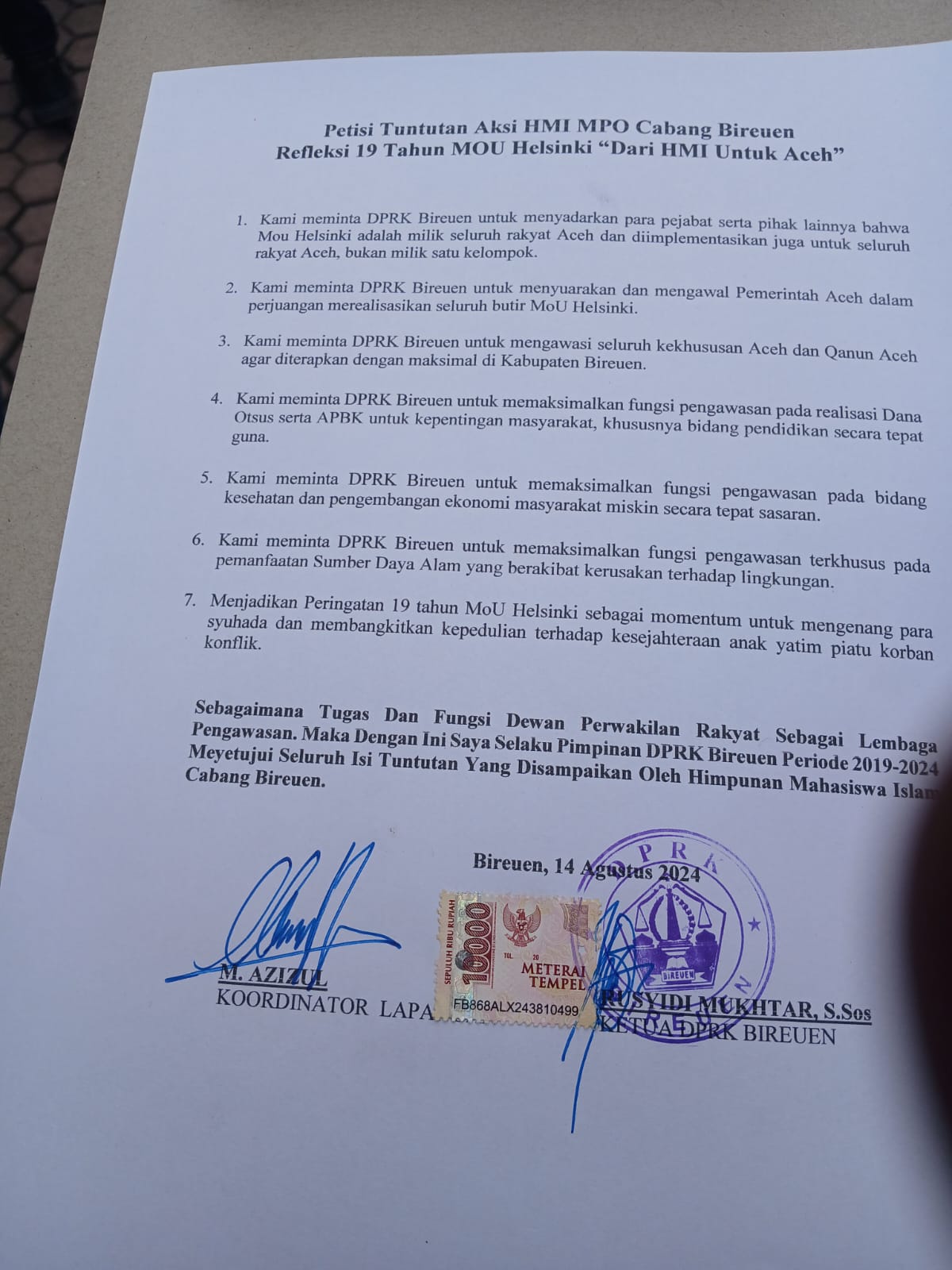“Sebagaimana tugas dan fungsi Dewan Perwakilan Rakyat (DPR), maka dengan ini saya selaku pimpinan DPRK Bireuen, periode 2019-2024, menyetujui seluruh isi tuntutan yang disampaikan oleh Himpunan Mahasiswa Islam MPO Cabang Bireuen,” yang tertulis di dalam kertas tersebut atas nama Ketua DPRK Bireuen, Rusyidi Mukhtar.