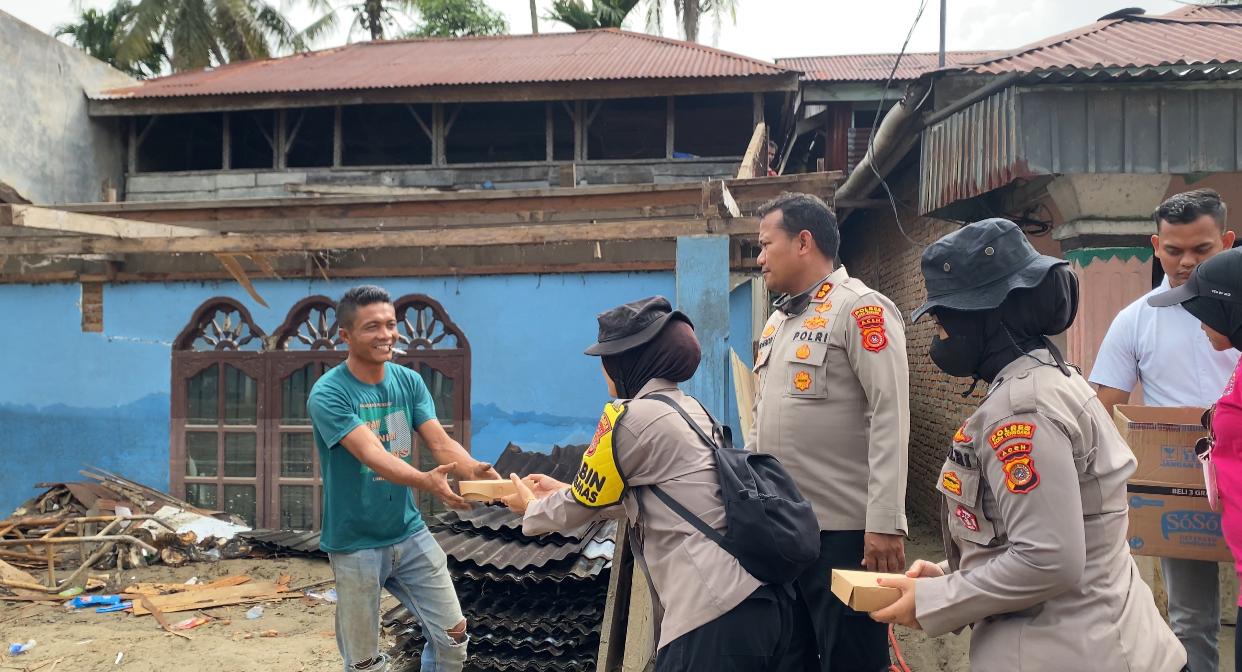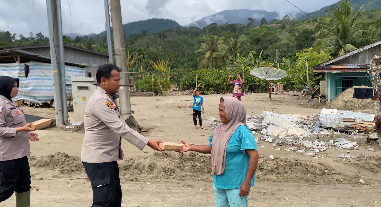 Dalam kegiatan tersebut, Kapolres Aceh Tenggara AKBP Yulhendri, S.I.K. membagikan nasi kotak kepada masyarakat serta memberikan bantuan berupa sedikit rezeki kepada warga yang kehilangan rumah akibat terjangan banjir.