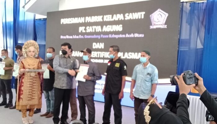Untuk mewujudkan hal tersebut, maka dilakukan peresmian PKS PT. Satya Agung dan penyerahan Sertifikat Plasma Kebun Kelapa Sawit bagi masyarakat sekitar kebun PT. Satya Agung. Peresmian dilakukan oleh Pj. Gurbernur Aceh Mayjen (Purn) Achmad Marzuki. Dalam peresmian ini turut dihadiri oleh Pj Bupati se-Provinsi Aceh, Muspika Kab. Aceh Utara, Direksi BNI, Direksi Bank Aceh, Pengurus GAPKI Pusat dan beberapa Direksi PTPN .