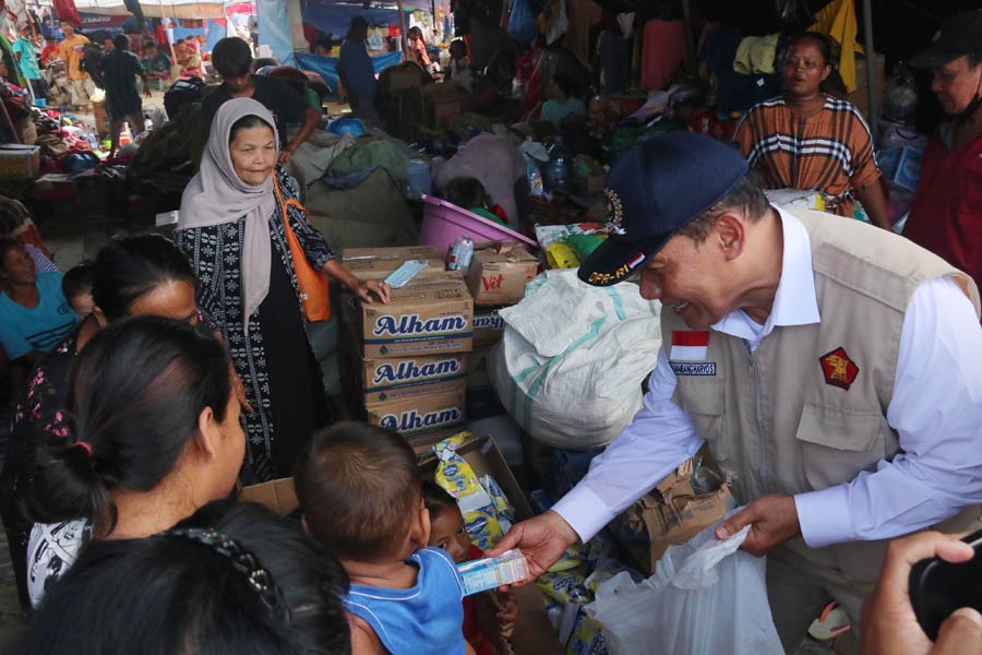 BHS yang juga pemilik usaha perkapalan PT Dharma Lautan Utama menyerahkan CSR perusahaan membantu korban banjir, Rabu (10/12/2025).
