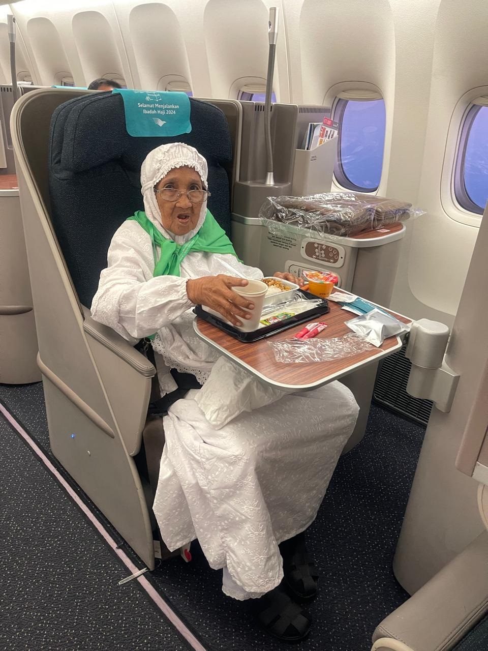 Ketika di dalam pesawat, Nenek Ruhamah sangat ceria, bahagia, dan selalu tersenyum. Pengalaman ini diceritakan dokter yang menemani Nenek Ruhamah di pesawat, apapun yang Ia ingin kerjakan, dikerjakan sendiri, sungguh tekad nenek untuk menyentuh Tanah Haram sangat luar biasa.