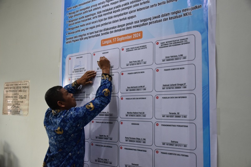 LANGSA (Waspada): Aparatur Sipil Negara (ASN) dan Pegawai Pemerintah dengan Perjanjian Kerja (PPPK) Dinas Komunikasi dan Informasi (Diskominfo) Kota Langsa melakukan penandatanganan Pakta Integritas sebagai komitmen dan pernyataan sikap netral sekaligus profesional dalam menyukseskan Pemilihan Kepala Daerah (Pilkada) serentak tahun 2024 di kantor dinas, Selasa (17/9).