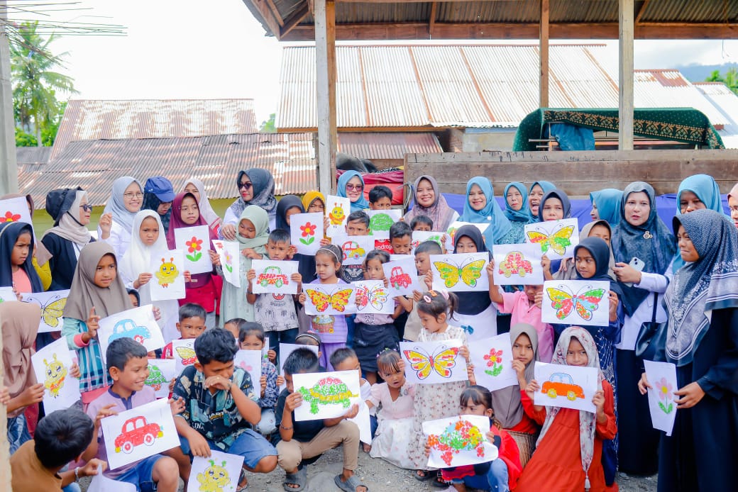 Menjelang akhir kegiatan, anak-anak kembali menggambar bersama. Kertas-kertas baru dibagikan, crayon berpindah tangan. Setelah itu, satu per satu anak menerima parcel makanan bingkisan sederhana yang disambut senyum lebar dan ucapan terima kasih polos.