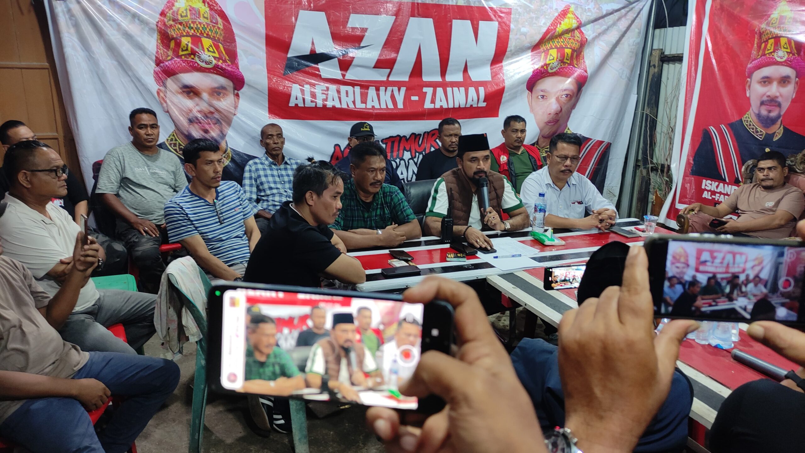PEUREULAK (Waspada): Calon Bupati Aceh Timur dari Partai Aceh Iskandar Usman Al-Farlaky, didampingi Ketua DPW PA Zulfadli Aiyub, Ketua KPA Wilayah Peureulak Hamdani Hasan, Ketua Tim Pemenangan Muntasir Age, dan sejumlah pendukung AZAN, menggelar konferensi pers, Rabu (27/11/2024) malam.