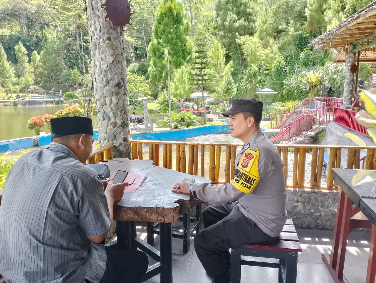 Patroli tersebut dilakukan oleh Bripka Wiwin Sudarma dan Bripka Ajarudin. Selain memastikan keamanan di sekitar area wisata, mereka juga menyampaikan beberapa pesan Kamtibmas kepada pemilik dan pengunjung obyek wisata tersebut.