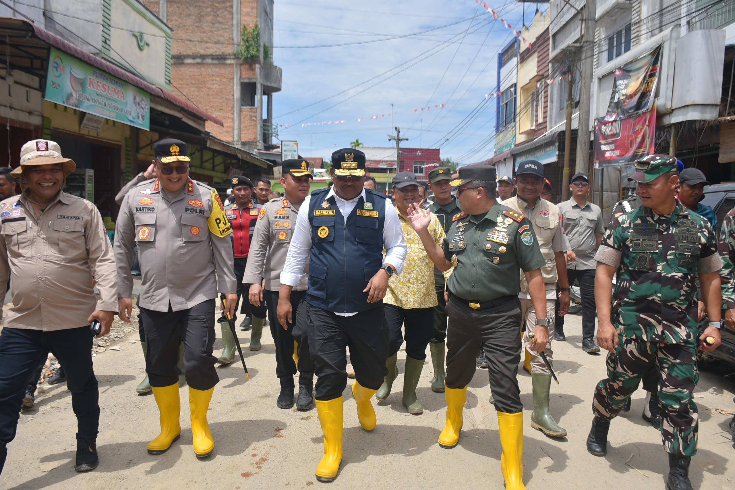 KUALASIMPANG (Waspada); Pj Gubernur Aceh, Safrizal ZA,AP,M.Si bersama Kapolda Aceh, Irjen Pol Achmad Kartiko dan Pangdam Iskandar Muda (IM) Mayjen TNI Niko Fahrizal meninjau tanggul yang jebol diterjang banjir akibat meluapnya Sungai Tamiang di Pekan Seruway, Kecamatan Seruway, Kabupaten Aceh Tamiang, Kamis (17/10).