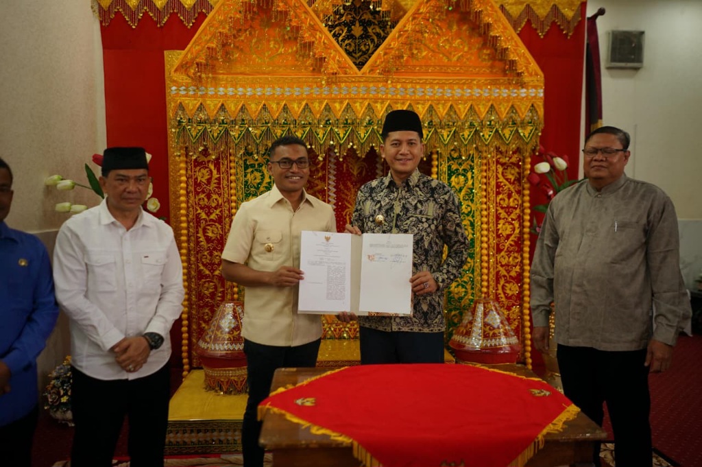BLANGPIDIE (Waspada.id): Bupati Aceh Barat Daya (Abdya) Safaruddin dan Bupati Aceh Selatan H Mirwan MS, Jumat (31/10), menandatangani kesepakatan kerja sama terkait penyediaan dan distribusi beras medium dan premium pada tahun 2026. Bertempat di Pendopo Bupati Abdya, Blangpidie.
