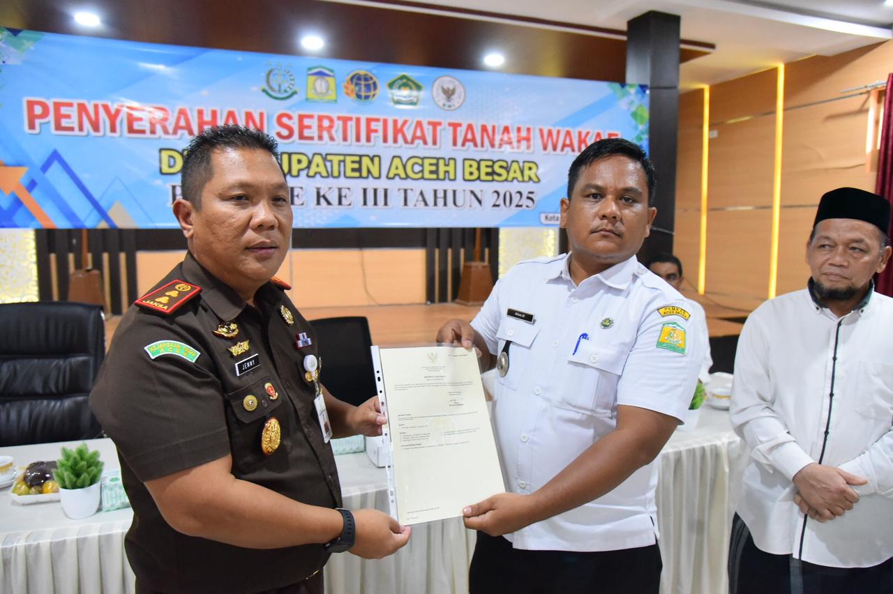 KOTA JANTHO (Waspada.id): Pemerintah Kabupaten (Pemkab) Aceh Besar mengapresiasi langkah Kejaksaan Negeri (Kejari) Aceh Besar dan Badan Pertanahan Nasional (BPN) dalam proses sertifikasi tanah wakaf di wilayah Kabupaten Aceh Besar, di Aula Burhanuddin Lopa, Kejari Aceh Besar, Kota Jantho, Rabu (22/10).