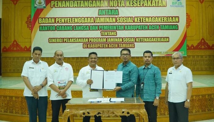 ACEH TAMIANG (Waspada): Pemerintah Kabupaten Aceh Tamiang bersama Badan Penyelenggara Jaminan Sosial (BPJS) Ketenagakerjaan Kantor Cabang Langsa melakukan Penandatanganan Nota Kesepakatan (MoU) tentang sinergi pelaksanaan program jaminan sosial ketenagakerjaan di Kabupaten tersebut.
