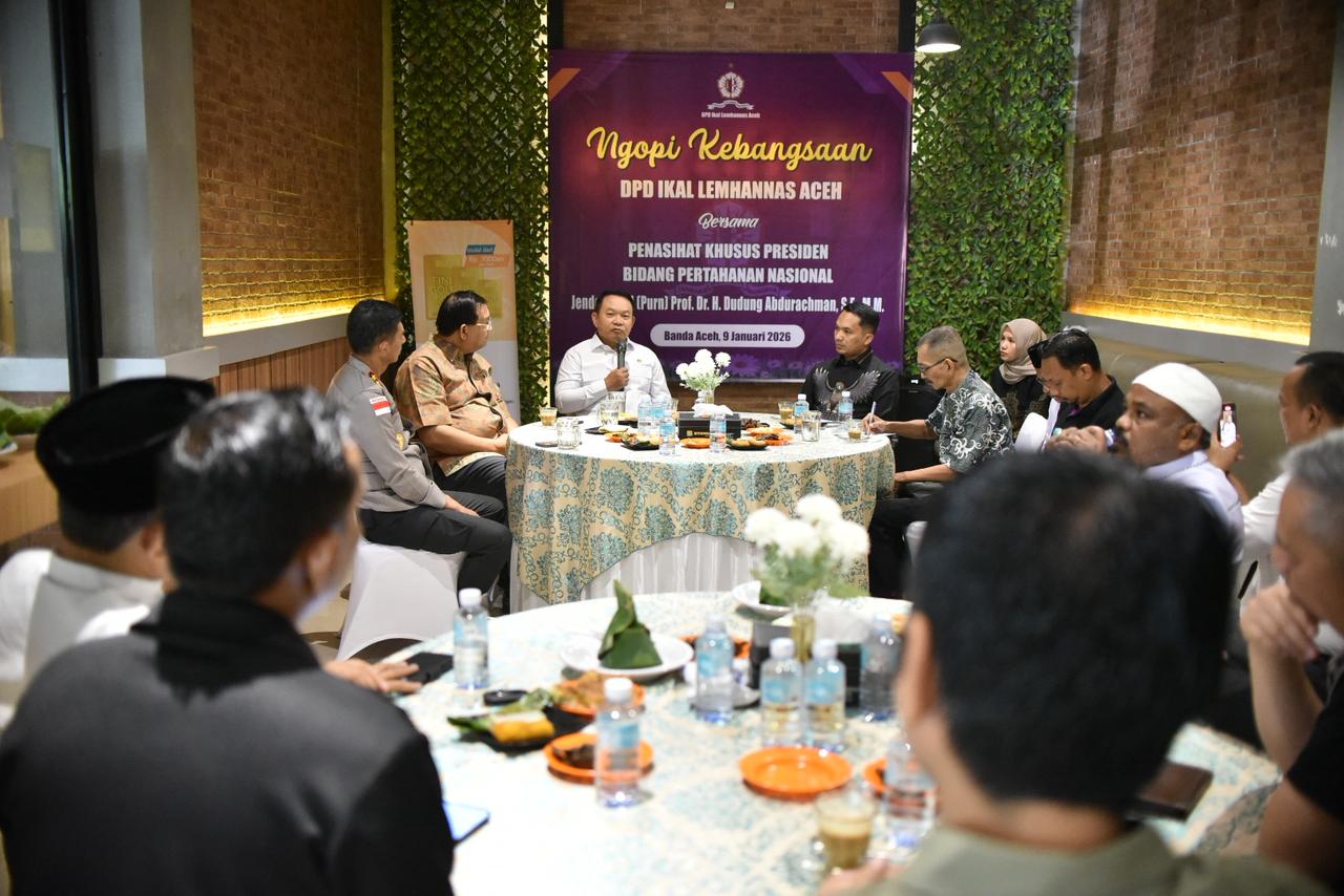 BANDA ACEH (Waspada.id): Penasehat Khusus Presiden Bidang Pertahanan Nasional, Jenderal TNI (Purn) Prof. Dr. H. Dudung Abdurachman, SE, MM, menggelar Ngopi Kebangsaan bersama Alumni Lemhannas Aceh, Jumat (9/1/2026) di Banda Aceh.