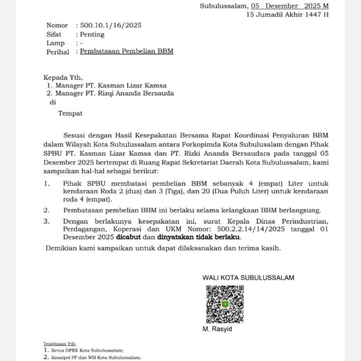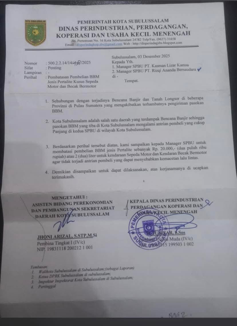 Menyikapi hal itu, Kepala Dinas Perindustrian, Perdagangan, Koperasi dan Usaha Kecil Menengah (Disperindagkop dan UKM) Kota Subulussalam, Junifar surati Manager SPBU PT Kasman Lizar Kamsa dan Manager SPBU PT Rizqi Ananda Bersaudara, melalui suratnya Nomor: 500.2.2.14/14/98/2025, 3 Desember 2025 dan turut menandatangani Asisten Bidang Perekonomian dan Pembangunan Setdako, Jhoni Arizal, terkait pembatasan pembelian BBM jenis Pertalite Rp20 ribu atau dua liter untuk setiap sepeda motor dan becak bermotor.