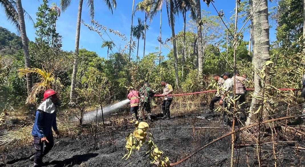 SABANG (Waspada.id): Personel gabungan dari Polres Sabang, Pemadam Kebakaran (Damkar), dan Badan Penanggulangan Bencana Daerah (BPBD) Kota Sabang bergerak cepat memadamkan kebakaran lahan perkebunan warga seluas sekitar 100 meter persegi. Kebakaran terjadi di Jr. Batu Singa Berfakta Gampong Krueng Raya, Kecamatan Sukakarya, Kota Sabang, pada Senin (6/10).