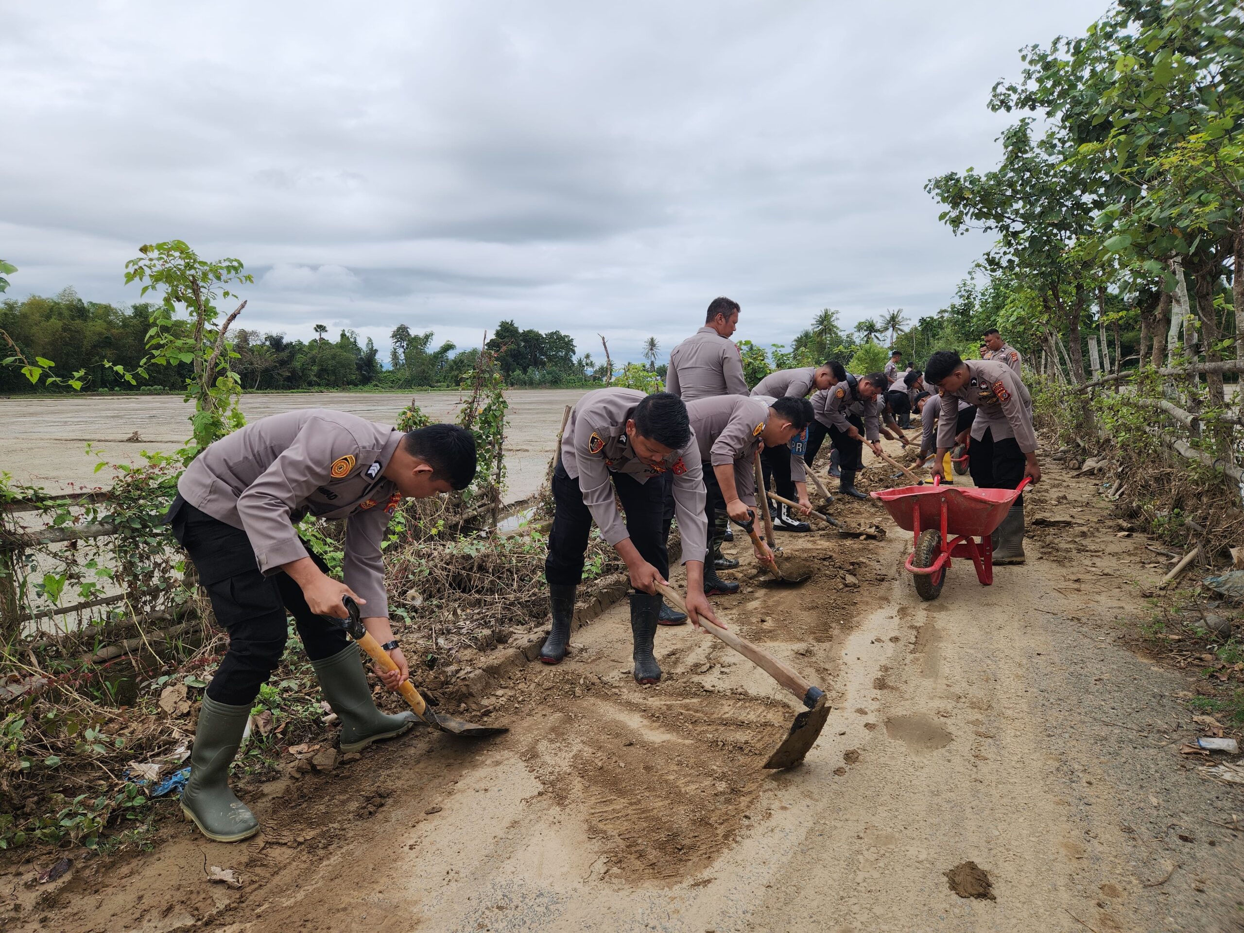 Personel yang terlibat berasal dari Posko Tanggap Darurat Bencana Polres Pidie, personel gabungan satuan fungsi, serta Polsek Kembang Tanjung. Dengan perlengkapan sederhana seperti cangkul, sekop, dan gerobak dorong, para personel menyisir badan jalan yang tertutup lumpur, pasir, dan sampah.