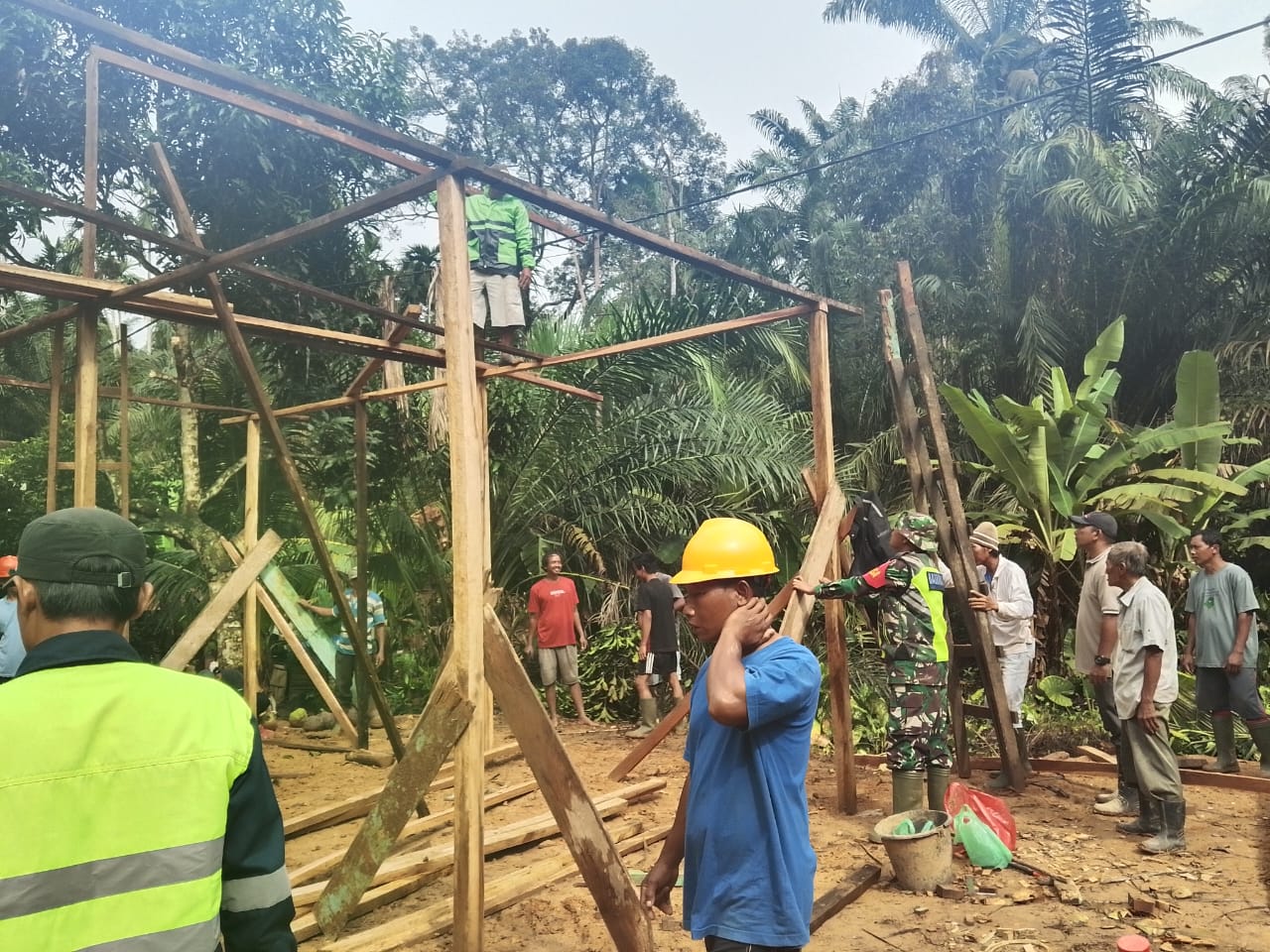 Sementara itu, dalam upaya membantu percepatan pemulihan rumah korban bencana alam yang terjadi, anggota Koramil 08/Rantau bersama masyarakat gotong royong bangun rumah sementara rumah milik Sunarno warga Kampung Suka Rakyat, Kecamatan Rantau yang rusak dan tertimbun tanah longsor.