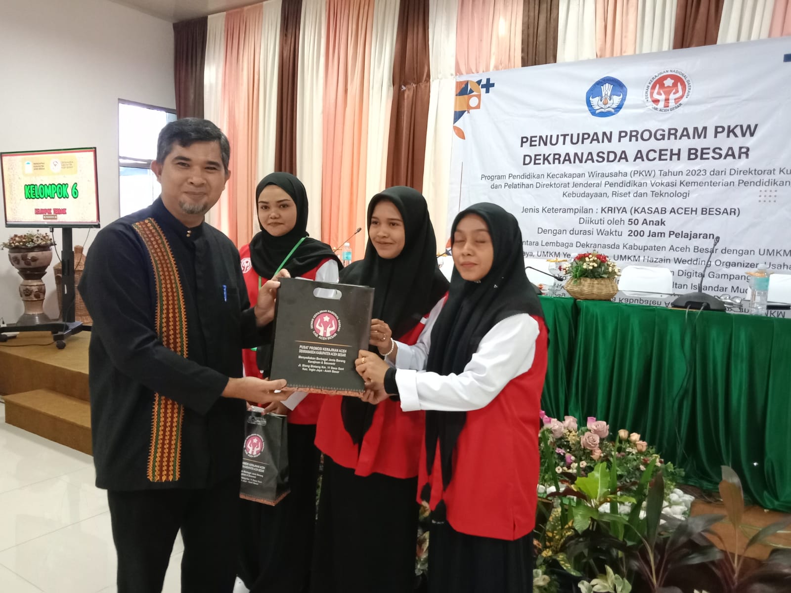 Penjabat (Pj) Ketua Dekranasda Aceh Besar Cut Rezky Handayani yang diwakili Koordinator Sekretariat Bidang Organisasi Dekranasda M Ali secara resmi menutup program pendidikan kecakapan wirausaha (PKW) Kejuruan Kriya Kasab di Gedung Dekranasda Aceh Besar, Gampong Gani, Kecamatan Ingi Jaya, Minggu (10/12).