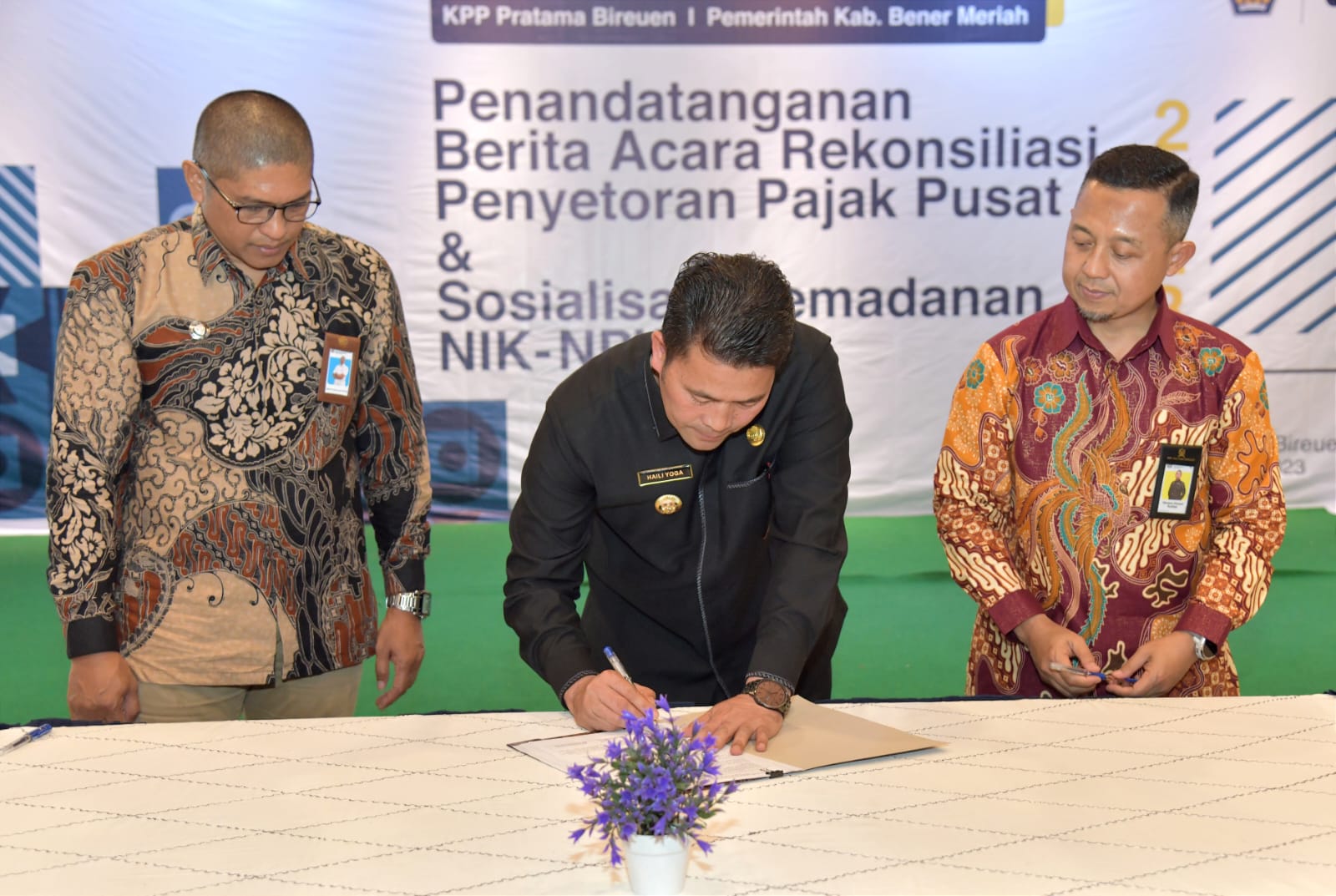 REDELONG (waspada): Pj Bener Meriah, Drs. Haili Yoga, M.Si menandatangani berita acara Rekonsiliasi Penyetoran Pajak Pusat dan Sosialisasi Pemadanan NIK-NPWP di Aula Gedung Kantor Pelayanan Pajak (KPP) Bireuen, Jumat (24/2).