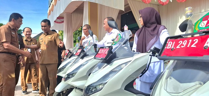 SIGLI (Waspada): Pj Bupati Pidie Drs Samsul Azhar menyerahkan tujuh sepeda motor pada peringatan Hari Kesehatan Nasional yang digelar di halaman kantor Dinas Kesehatan Kabupaten Pidie, Selasa (12/11) pagi.