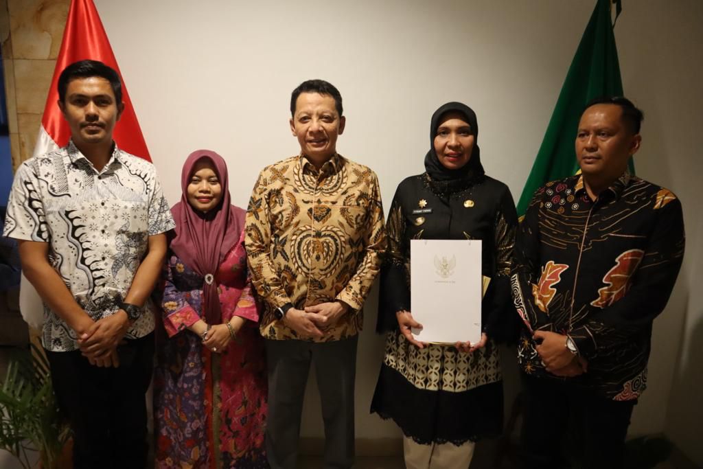 NAGAN RAYA (Waspada): Penjabat Gubernur Aceh, Achmad Marzuki menyerah surat keputusan (SK) perpanjangan masa jabatan Pj Nagan Raya Fitriany Farhas oleh Menteri Dalam Negeri (Mendagri) Tito Karnavian di Kantor Badan Penghubung Pemerintah Aceh (BPPA) Jakarta, Rabu (11/10).