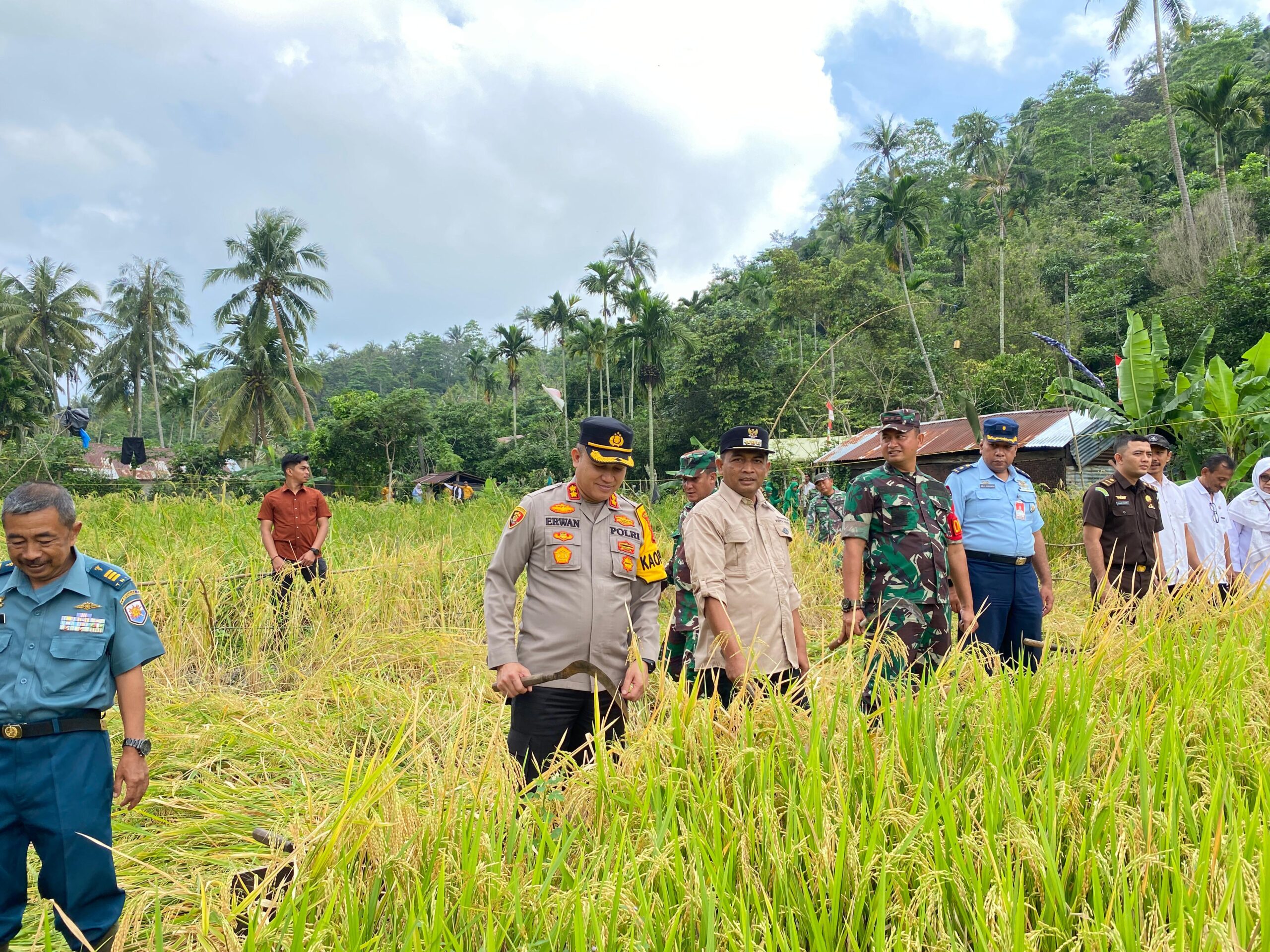 SABANG (Waspada) : Kapolres Sabang, AKBP Erwan S.H., MH, bersama Pj.Walikota Sabang, Andri Nourman, AP., M.Si, hadir dalam acara panen perdana padi gogo yang ditanam di lahan seluas 10.000 m² di kawasan Jr. Lhok Batee, Gp.Cot Abeuk Kec.Sukajaya Kota Sabang, pada Senin, dengan Estimasi hasil panen padi gogo kali ini diperkirakan mencapai 600 kilogram, Rabu (15/01).