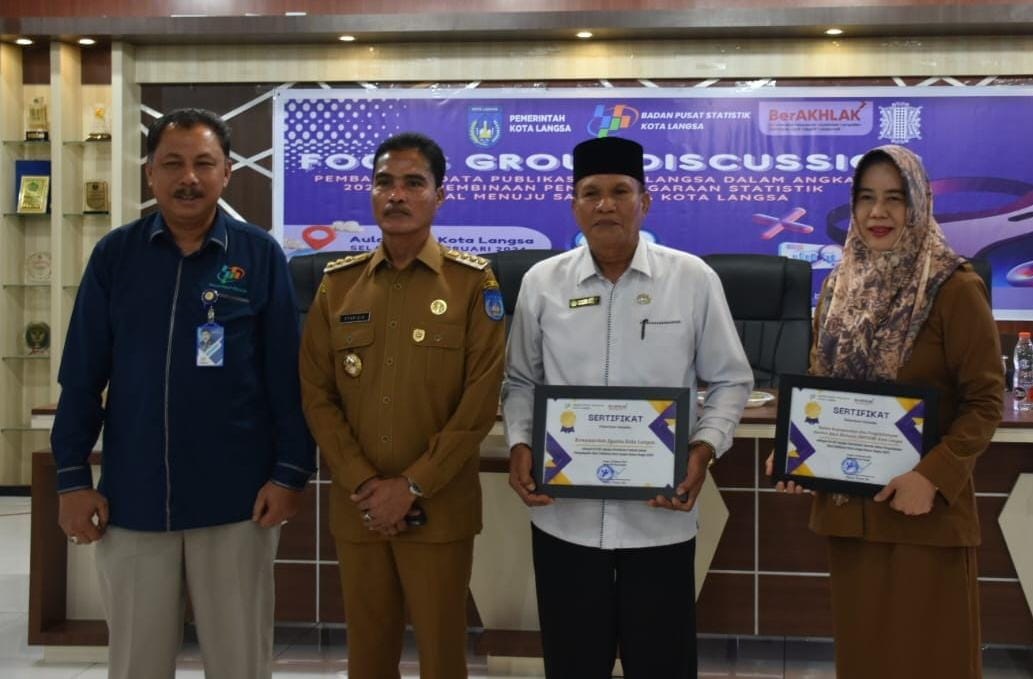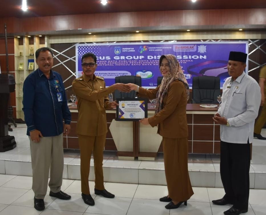 Penyerahan tersebut diberikan Pj Wali Kota saat menggelar Forum Grup Discussion (FGD) Pembahasan Data Publikasi Kota Langsa Dalam Angka Dan Pembinaan Statistik Sektoral Tahun 2024 untuk mendukung Penyelenggaraan Satu Data Kota Langsa di Aula Sekda Kota Langsa, Selasa (20/2).