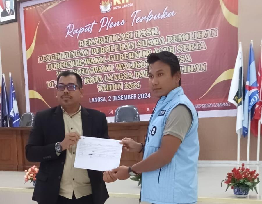 Sebelumnya, sidang rapat pleno terbuka rekapitulasi hasil perhitungan, perolehan suara pemilihan Gubernur/Wakil Gubernur Aceh dan Wali Kota/Wakil Wali Kota Langsa di tingkat Kota Langsa dibuka langsung Ketua KIP Langsa Ridwan, ST dihadiri komisioner lainnya Muhammad Alfadhal, M.Si, Rahmadhani, S.SosI, Fauzan Rizal, SPd.I, Dr (Cand) Bahtiar MA di aula Vitra Tirta.