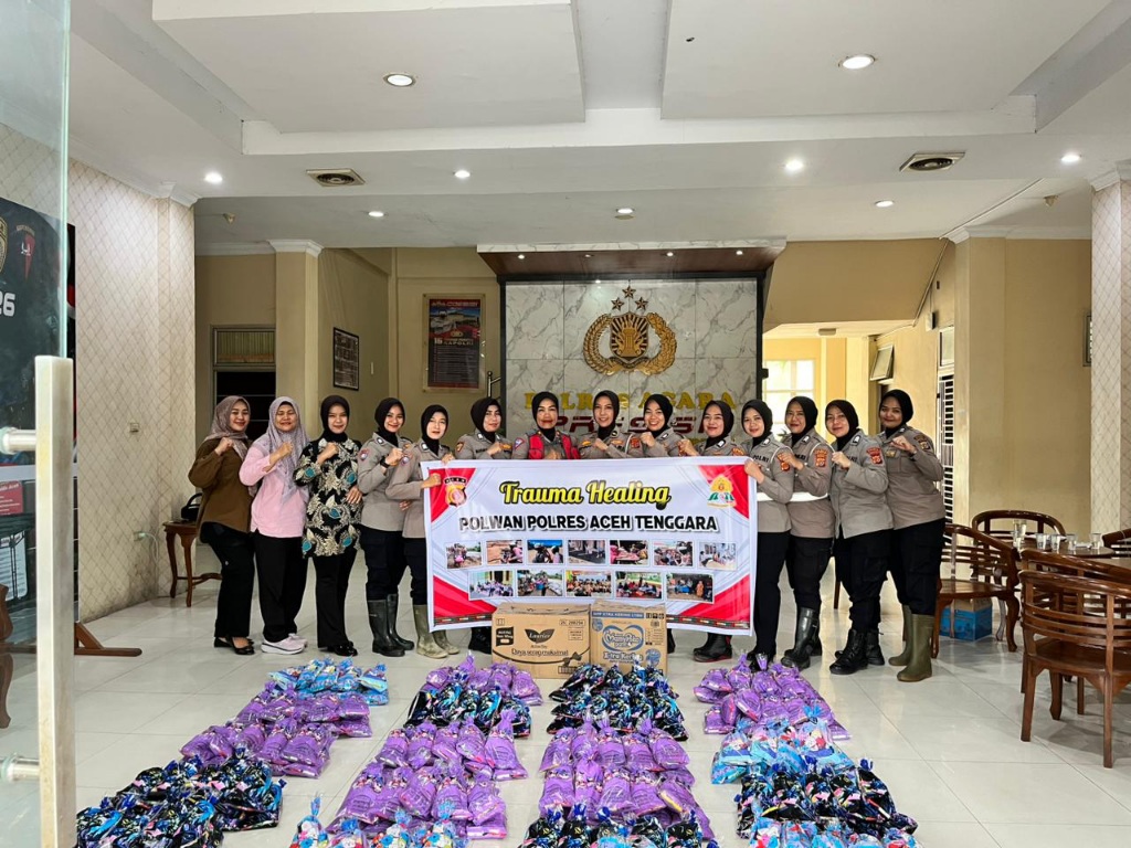 Sementara, dalam rangka memberikan dukungan moral dan pemulihan psikologis bagi korban banjir, Polwan Polres Aceh Tenggara melaksanakan kegiatan Trauma Healing kepada perempuan dan anak-anak di Kecamatan Ketambe. Kegiatan ini dilakukan di tiga desa yang terdampak banjir bandang pada 26 November 2025 lalu, yaitu Desa Lauser, Desa Lak-Lak, dan Desa Lawe Penanggalan.