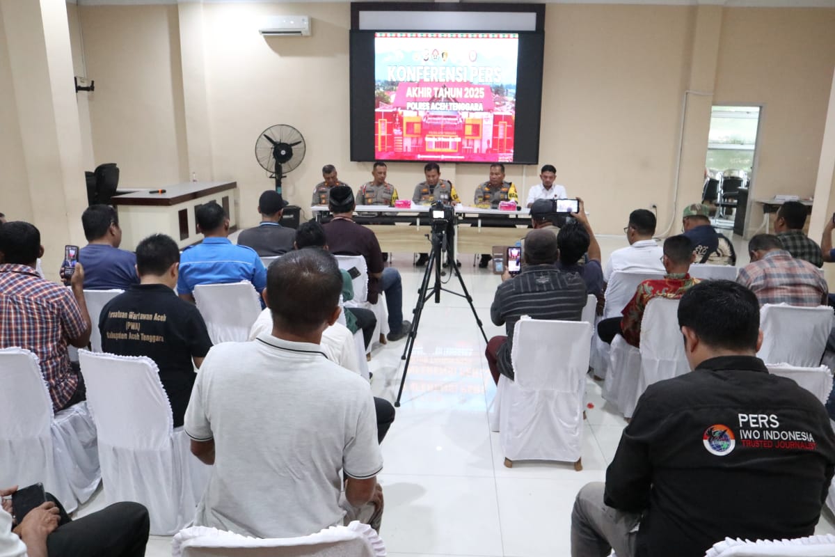 KUTACANE (Waspada.id): Polres Aceh Tenggara menggelar Konferensi Pers Akhir Tahun 2025 di Aula Wira Pratama Rabu (31/12) pukul 17.00 WIB, yang dipimpin langsung Kapolres AKBP Yulhendri, S.H., S.I.K., M.I.K., dengan dihadiri pejabat utama dan insan media.