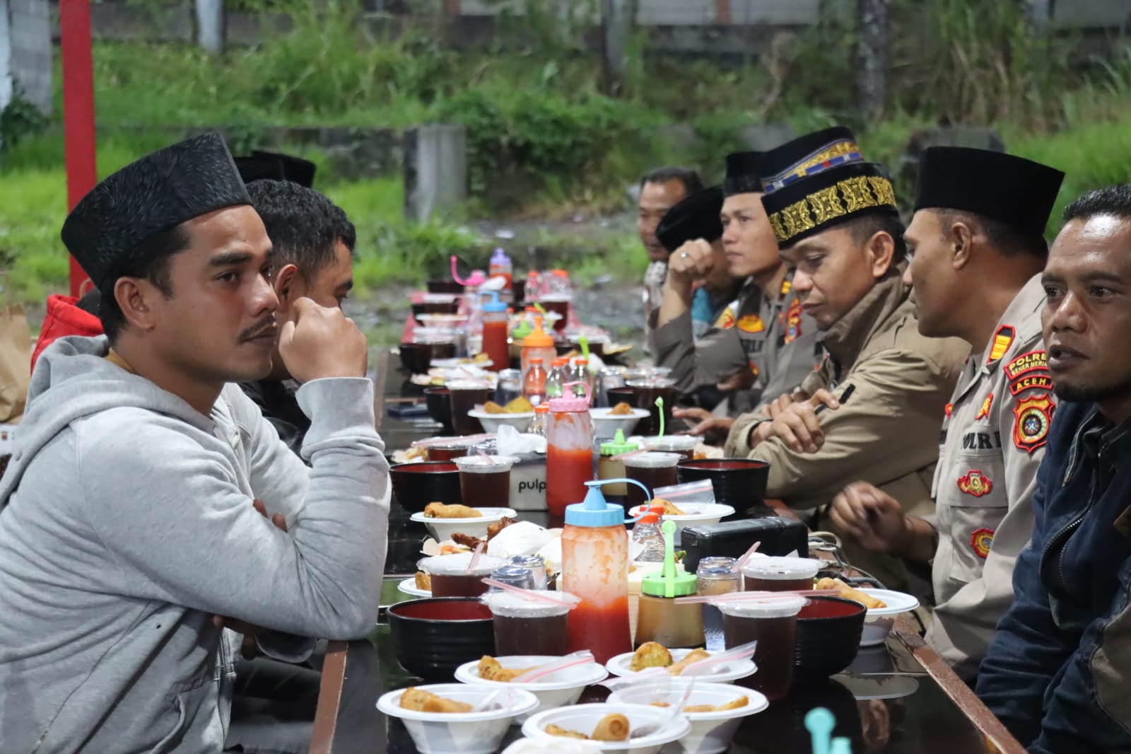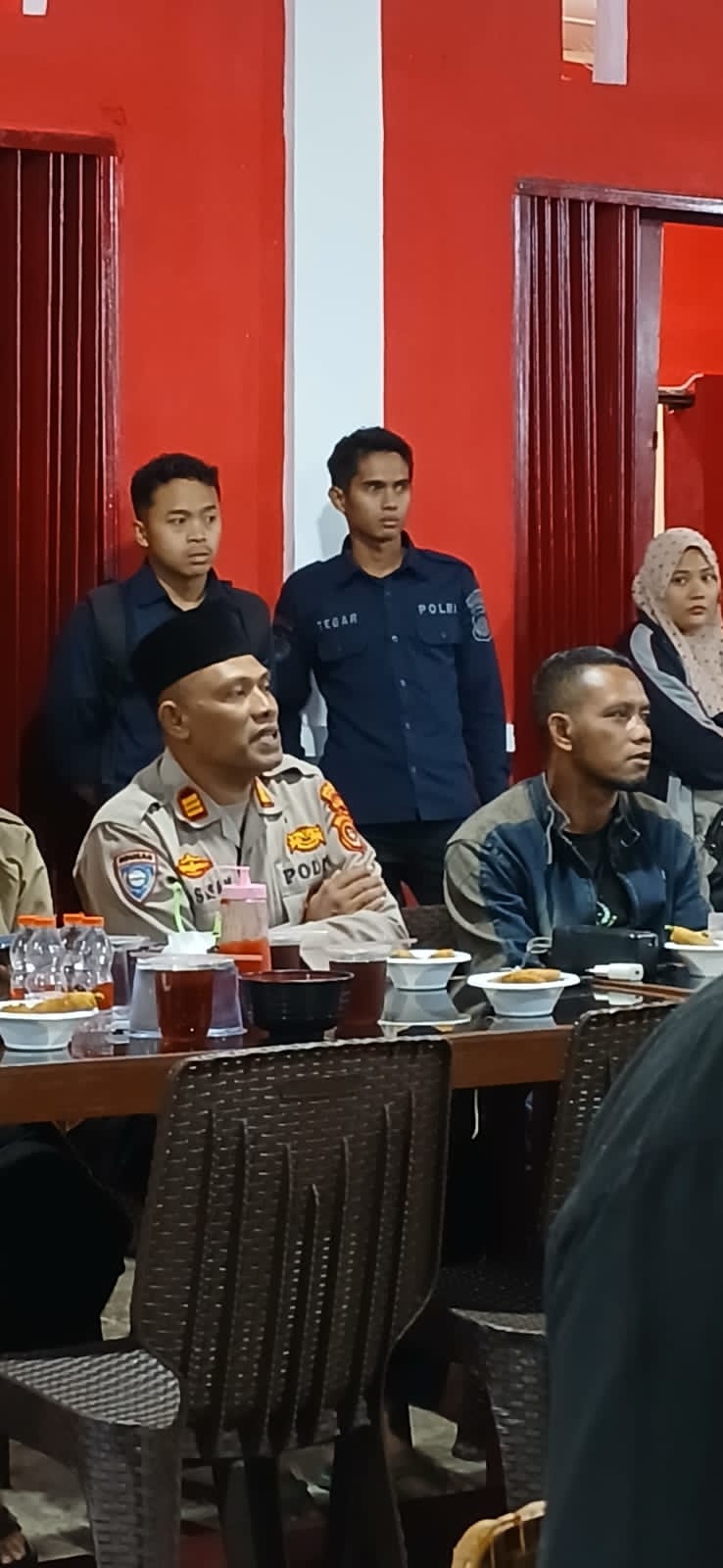 Setelah pembagian takjil, kegiatan dilanjutkan dengan buka puasa bersama yang berlangsung dalam suasana hangat dan penuh keakraban. Para anggota kepolisian dan wartawan tampak berbincang santai, menciptakan nuansa kekeluargaan.