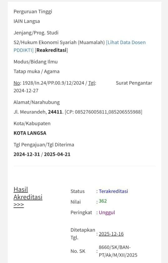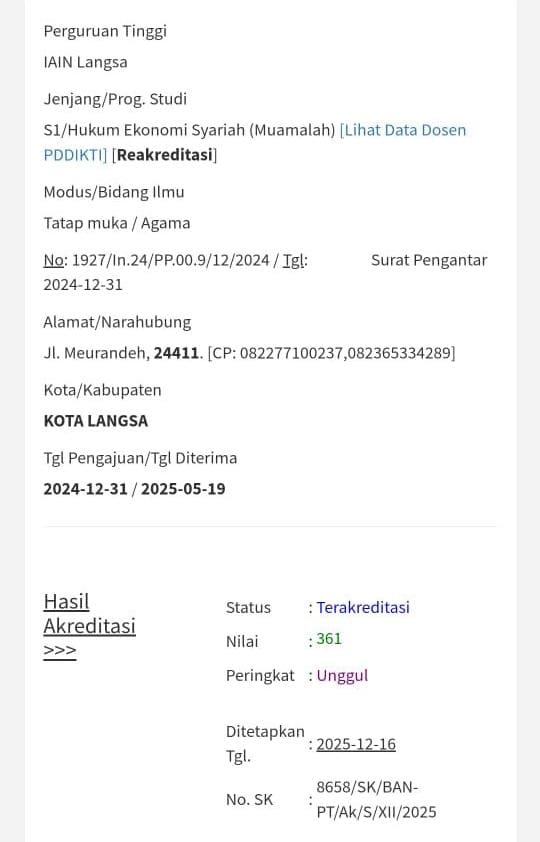 LANGSA (Waspada.id): Di tengah suasana duka pascabanjir dan longsor yang melanda Kota Langsa dan sekitarnya, Institut Agama Islam Negeri (IAIN) Langsa menerima kabar yang menjadi penguat semangat bersama. Program Studi S1 dan S2 Hukum Ekonomi Syariah berhasil meraih akreditasi Unggul dari Badan Akreditasi Nasional Perguruan Tinggi (BAN-PT).