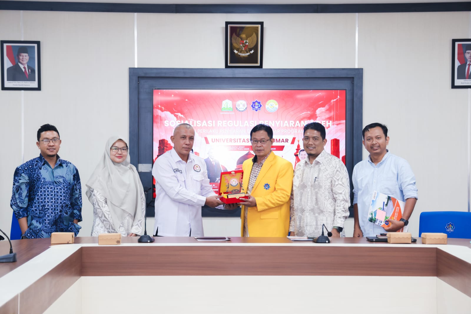 Sebagai bentuk apresiasi atas kunjungan puncak ini, pihak fakultas dan prodi menyerahkan cinderamata kepada jajaran komisioner KPI Aceh, disaksikan oleh seluruh dosen dan mahasiswa peserta yang hadir.