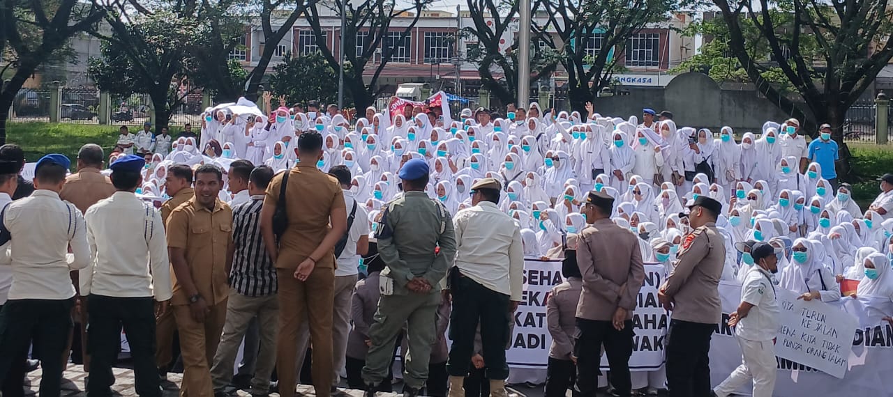 BIREUEN (Waspada) : Ratusan honorer Tenaga Kesehatan (Nakes) dari berbagai kecamatan melakukan aksi damai di depan Kantor Pusat Pemerintahan Kabupaten Bireuen, Selasa, (14/1).
