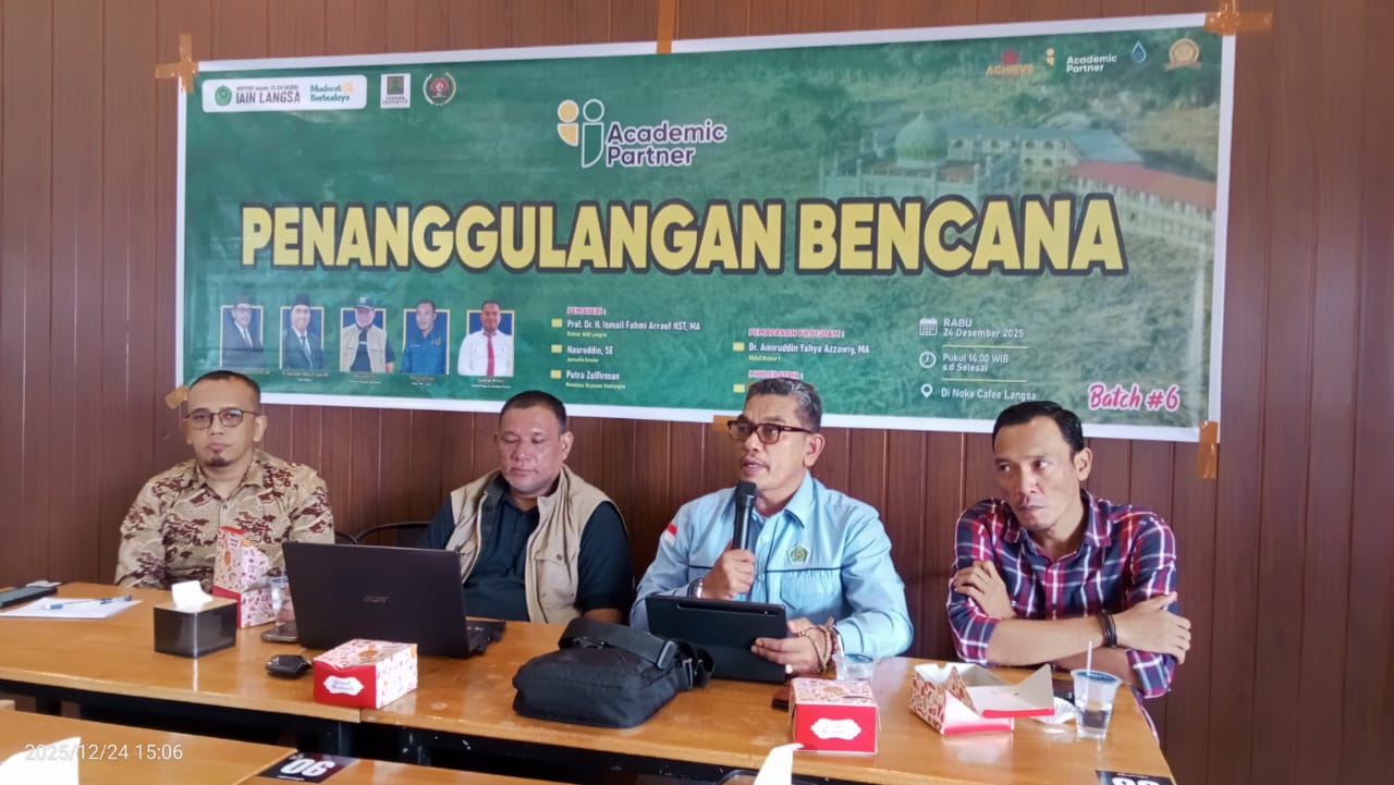 Academic Partner Batch VI IAIN Langsa bertajuk ‘Penanggulangan Bencana’ menghadirkan tiga pemateri yakni, Rektor IAIN Langsa, Prof. Dr Ismail Fahmi Arrauf, Ketua PWI Langsa Putra Zulfirman dalam materinya menyampaikan terkait Teknik Reportase Bencana dan Pembina Yayasan Geutanyoe Nasruddin, SE memaparkan Mitigasi Pencegahan Bencana Pra dan Pascabencana.