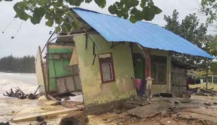 IDI (Waspada): Abrasi, rumah milik Samiah Ismail, dihantam ombak di Desa Teupin Jareng, Kecamatan Idi Rayeuk, Kabupaten Aceh Timur, Selasa (17/9). Rumah bantuan persis di bibir pantai Kuala Peudawa Puntong itu kini tidak dapat ditempati lagi.