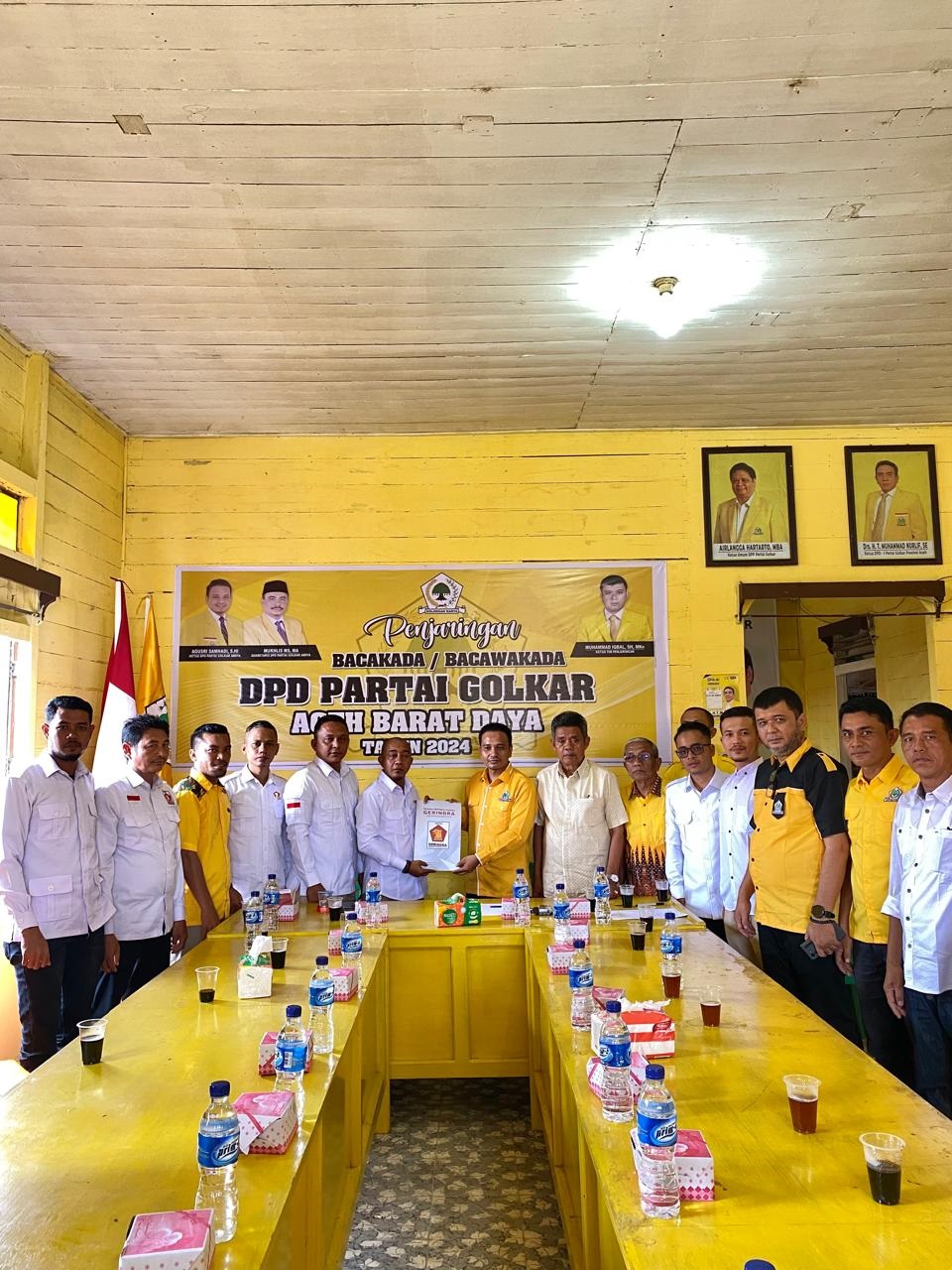 BLANGPIDIE (Waspada): Wakil Ketua DPR Aceh Dr Safaruddin SSos MSP, menyerahkan berkas pendaftaran sebagai bakal calon (balon) Bupati, ke Dewan Pengurus Daerah (DPD) II Partai Golkar Aceh Barat Daya (Abdya). Kamis (25/4).