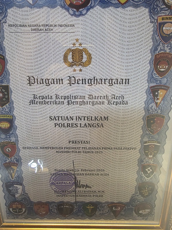 “Alhamdulillah, Satintelkam Polres Langsa berhasil mendapatkan penghargaan dari Bapak Kapolda Aceh Irjen Pol. Drs. Marzuki Ali Basyah atas inovasi dan meluncurkan program Surat Keterangan Catatan Kepolisian (SKCK) keliling yang kita gagas pada tahun 2026 ini dengan predikat penilaian A,” sebut Kapolres Langsa, AKBP Mughi Prasetyo Habrianto, SIK, melalui Kasat Intelkam Polres Langsa Iptu Zulmahrita, S.E., M.Si kepada wartawan, Rabu (25/02/2026).