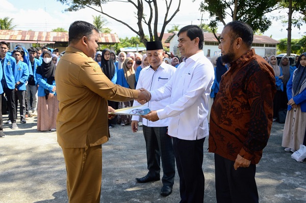 KOTA JANTHO (Waspada): Penjabat (Pj) Bupati Aceh Besar diwakili Sekretaris Daerah, Drs Sulaimi MSi menerima penyerahan 351 mahasiswa peserta Kuliah Pengabdian Masyarakat (KPM) Reguler UIN Ar Raniry Banda Aceh semester ganjil tahun akademik 2023/2024 di halaman Kantor Camat Blang Bintang, Aceh Besar, Senin (18/9). Mereka akan melaksanakan kegiatan KPM di 3 Kecamatan dalam wilayah Kabupaten Aceh Besar, yaitu Kecamatan Montasik, Blang Bintang dan Suka Makmur.