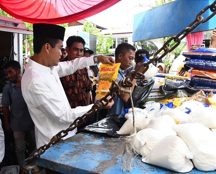 LANGSA (Waspada): Pj Wali Kota Langsa, Dr Syaridin, S.Pd., M.Pd meninjau kegiatan pasar murah yang dilaksanakan Dinas Koperindag dan UMKM Kota Langsa dalam rangka stabilitas harga bahan pokok sekaligus upaya pengendalian inflasi di Lapangan Merdeka Langsa, Jumat (18/10).