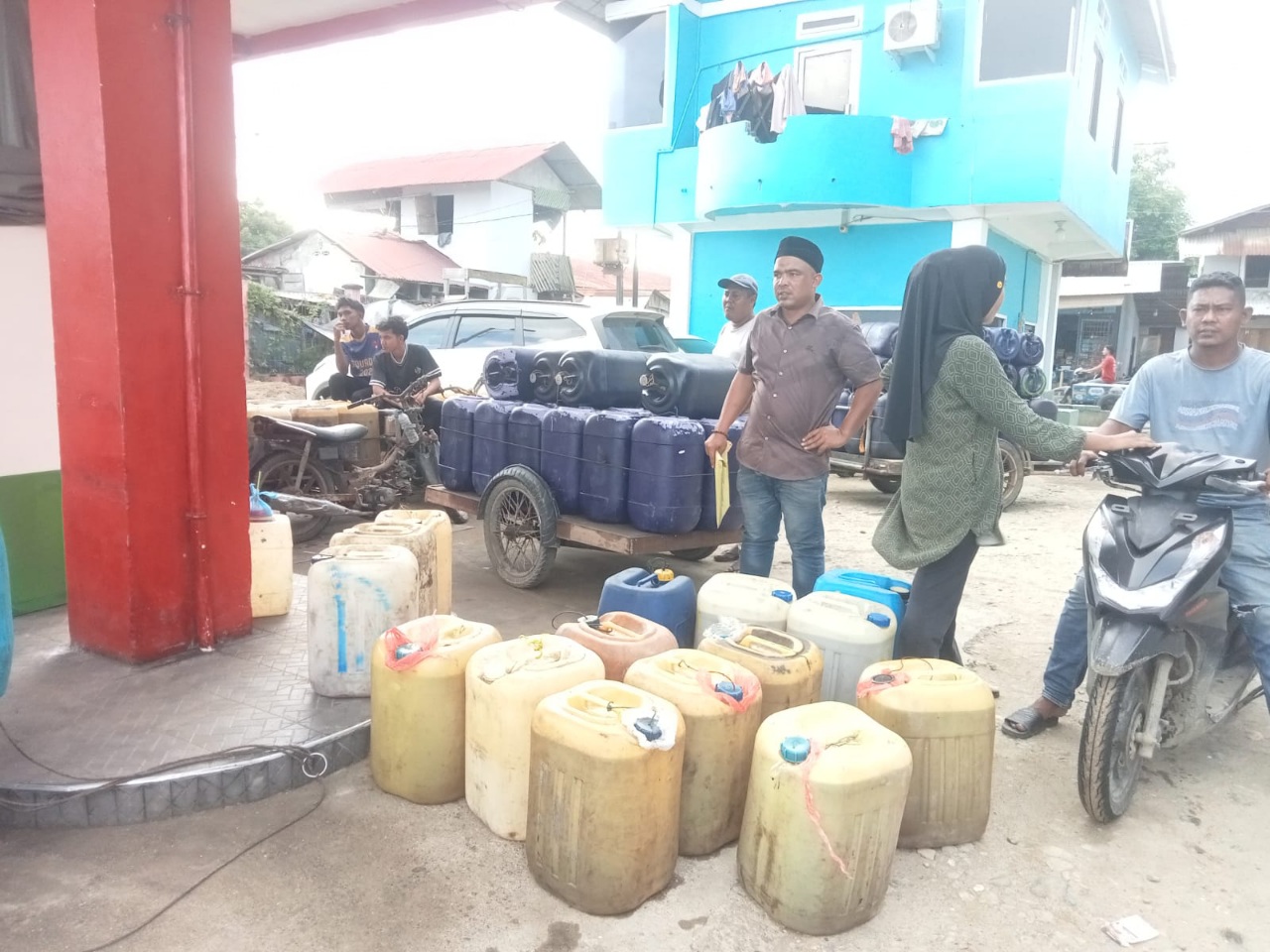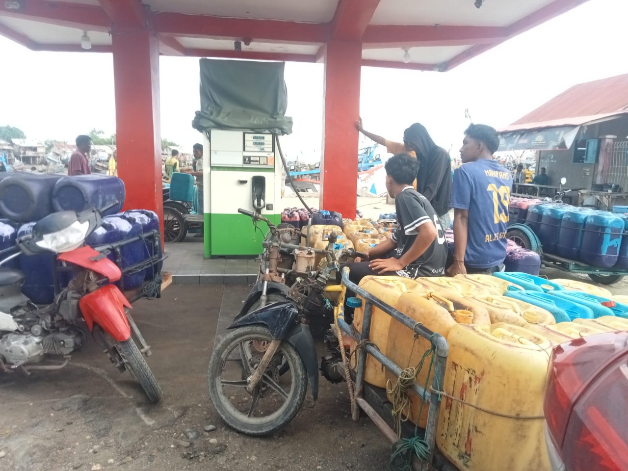 Pantauan di lapangan, para nelayan membawa jerigen yang diangkut becak mesin tampak saling mendahului giliran dalam antrean di SPBU.